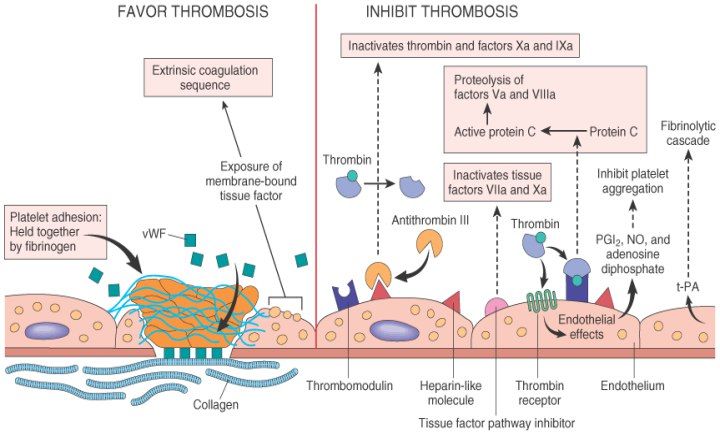 Мы уже рассмотрели частично, как фармакологически можно воздействовать на эти процессы. Но существуют и эндогенные механизмы. Так, например, NO и простациклин из соседних неповрежденных клеток эндотелия стимулируют процессы вазодилатации и ингибируют агрегацию тромбоцитов. PGI2 ингибирует высвобождение ферментов из гранул. Все эти процессы приводят к тому, что тромбоциты не могут образовывать псевдоподии и начинают хуже крепиться к сосудистой стенке. Простациклин активирует аденилатциклазу, что приводит к повышению концентрации цАМФ и обратному току ионов кальция из цитозоля в плотные гранулы, и таким образом стабилизирует сами тромбоциты.