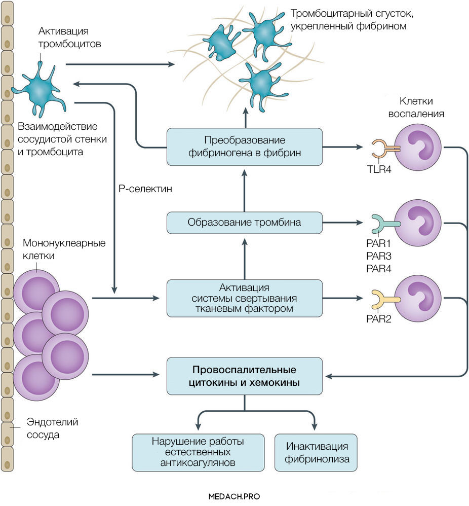 Тканевой фактор (ТФ) представляет собой мембрано-ассоциированный гликопротеин, находящийся в субэндотелиальном слое сосудов, в физиологических условиях не контактирующий с кровью. Выброс тканевого фактора могут спровоцировать различные процессы, такие как прямое повреждение сосудов, воспалительные и иммунологические реакции. При сепсисе ТФ непосредственно продуцируется моноцитами, а также выделяется в результате взаимодействия тромбоцитов со стенкой сосудов, что приводит к значительному усилению коагуляции. Выброс провоспалительных цитокинов и хемокинов провоцируется взаимодействием ТФ, тромбина и других факторов коагуляции с воспалительными клетками через специфические протеаза-активируемые рецепторы (PARs) 1–4 типа, а также дополнительно тромбином через Toll-like рецепторы 4 типа (TLR4). Развитие ДВС на фоне онкологических процессов имеет свои особенности, так как некоторые опухоли могут производить прокоагулянтные факторы (тканевой фактор и цистеиновая протеаза фактора X) (рис. 2).