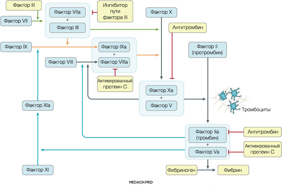 Реакции коагуляции контролируются противосвертывающей системой крови, включающей в себя: антитромбин (блокирует фактор Xa и тромбин), протеин С (протеолитически разрушает Va и VIIIa факторы), ингибитор пути тканевого фактора (ингибирует комплекс тканевой фактор-VIIa фактор).