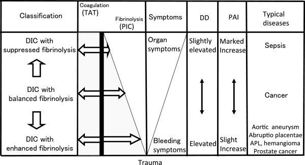 В столбце «Symptoms» обозначен переход от кровотечений к органному поражению (развитие микро- и макротромбозов). На данном рисунке не обозначены продукты деградации фибрина (ПДФ), тем не менее при гиперфибринолитическом фенотипе ДВС имеется тенденция к преобладанию ПДФ над количеством Д-димеров. При терапии препаратами транс-ретиноевой кислоты при остром промиелоцитарном лейкозе ингибируется экспрессия опухолевыми клетками аннексина II, в результате чего меняется и фенотип ДВС (теряет характеристики гиперфибринолитического, приобретая характеристики прокоагулянтного фенотипа).