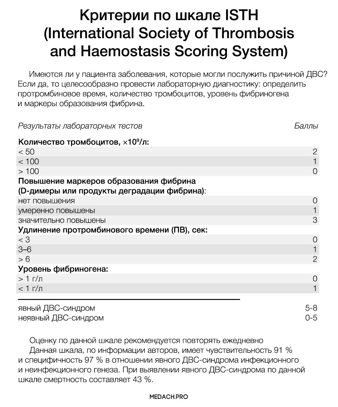 Критерии для выявления ДВС-синдрома по шкале ISTH (International Society of Thrombosis and Haemostasis Scoring System):