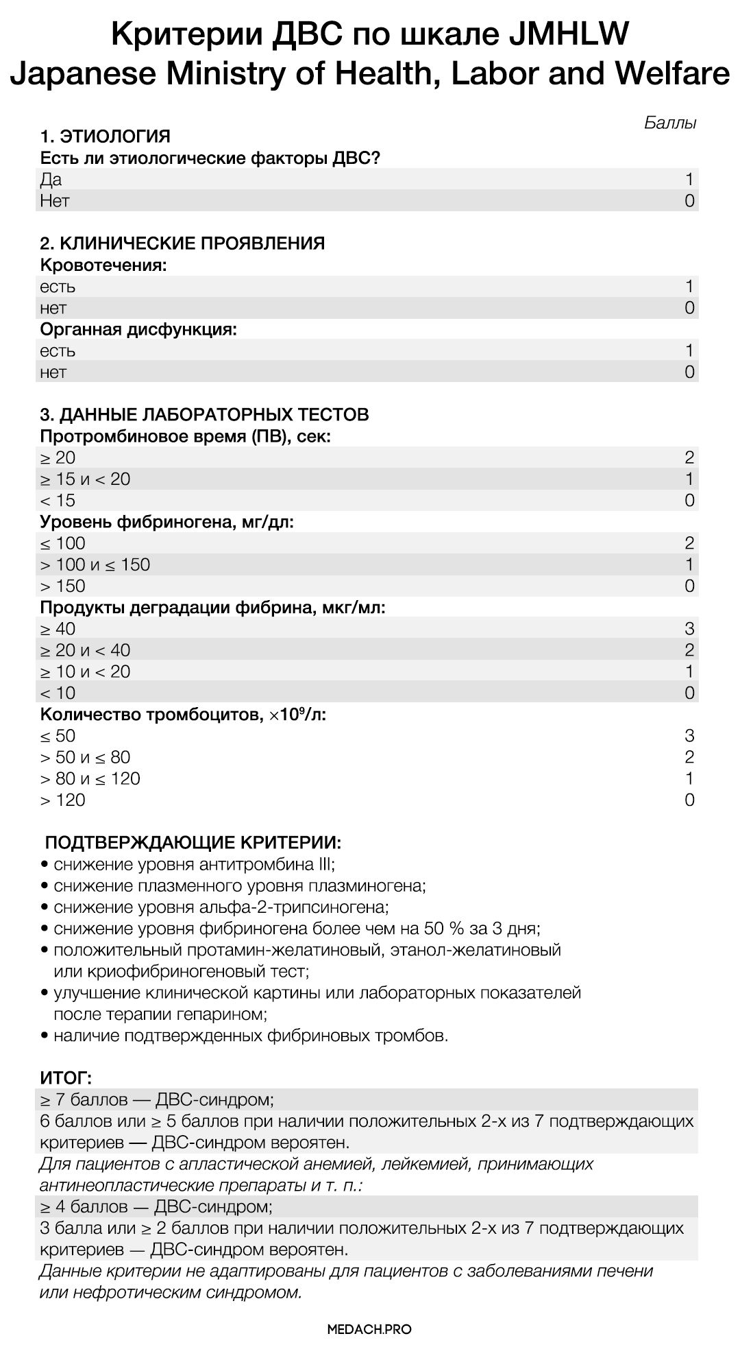 Критерии ДВС Japanese Ministry of Health, Labor and Welfare (JMHLW):