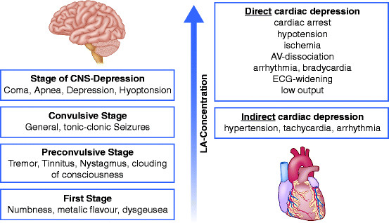 Развитие признаков поражения сердца классически протекает в три фазы. Начальная фаза включает в себя гипертонию и тахикардию. Промежуточная фаза связана с депрессией миокарда и гипотонией. Терминальная фаза включает периферическую вазодилатацию, тяжелую гипотензию и различные аритмии, такие как синусовая брадикардия, AV-блокады, желудочковые тахиаритмии и, как финал, развитие асистолии. Причем в большинстве случаев подобная картина развивается после появления предвестников со стороны ЦНС. Симптомы кардиотоксичности обычно имеют стойкий характер и могут сохраняться в течение нескольких часов после инъекции даже небольших доз МА, например, бупивакаина в дозе 1 мг/кг.