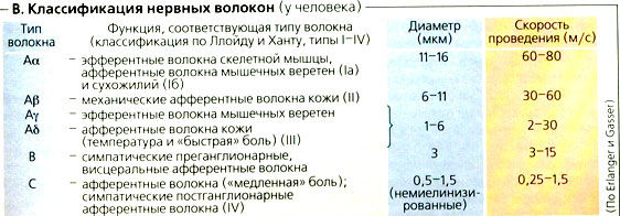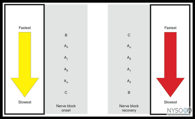 Двигательные волокна посылают импульсы с меньшей частотой и более коротким потенциалом действия. Аδ-волокна, с которыми связано возникновение «первичной» острой боли, и C-волокна, с которыми связано возникновение «вторичной» тупой боли, имеют маленький диаметр и участвуют в передаче высокочастотных болевых импульсов. Поэтому они блокируются раньше и меньшими концентрациями местных анестетиков, чем двигательные Аα-волокна.