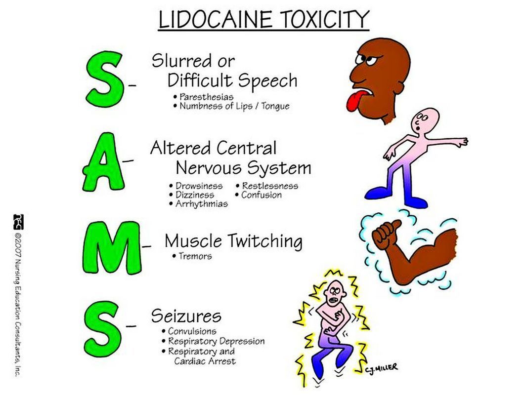 Токсичность МА проявляется в виде системного (воздействие на ЦНС и сердце) и локального токсического действия (прямое нейро-, миотоксическое; преходящие неврологические симптомы, аллергические реакции). Большие дозы повышают риск развития СТМА, в то же время высокие концентрации анестетика и длительное нахождение препарата в крови (в большей степени, чем общая доза) определяют прямой нейротоксический эффект.
