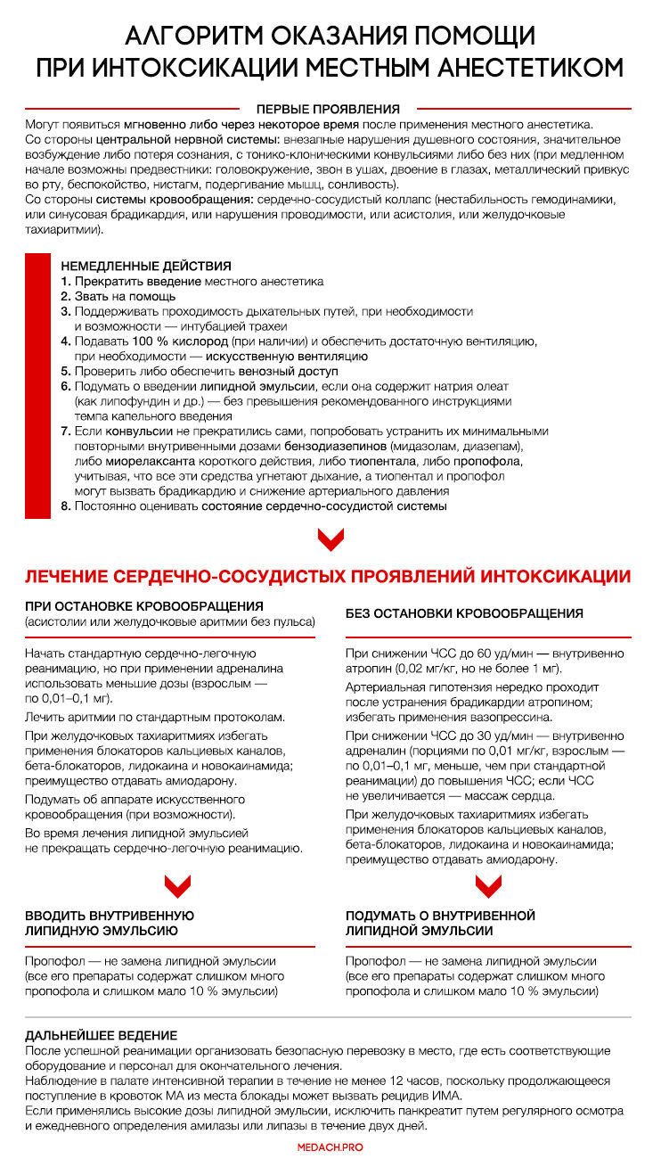 В зависимости от этого классическая клиническая картина может претерпевать некоторые изменения. Например, при внутривенном введении МА неспецифические предвестники могут отсутствовать, и первым симптомом могут явиться тонико-клонические судороги с развитием признаков поражения сердца. При быстром достижении Cssmax МА признаки развивающейся кардиотоксичности могут появиться одновременно с судорогами или даже опережать их.