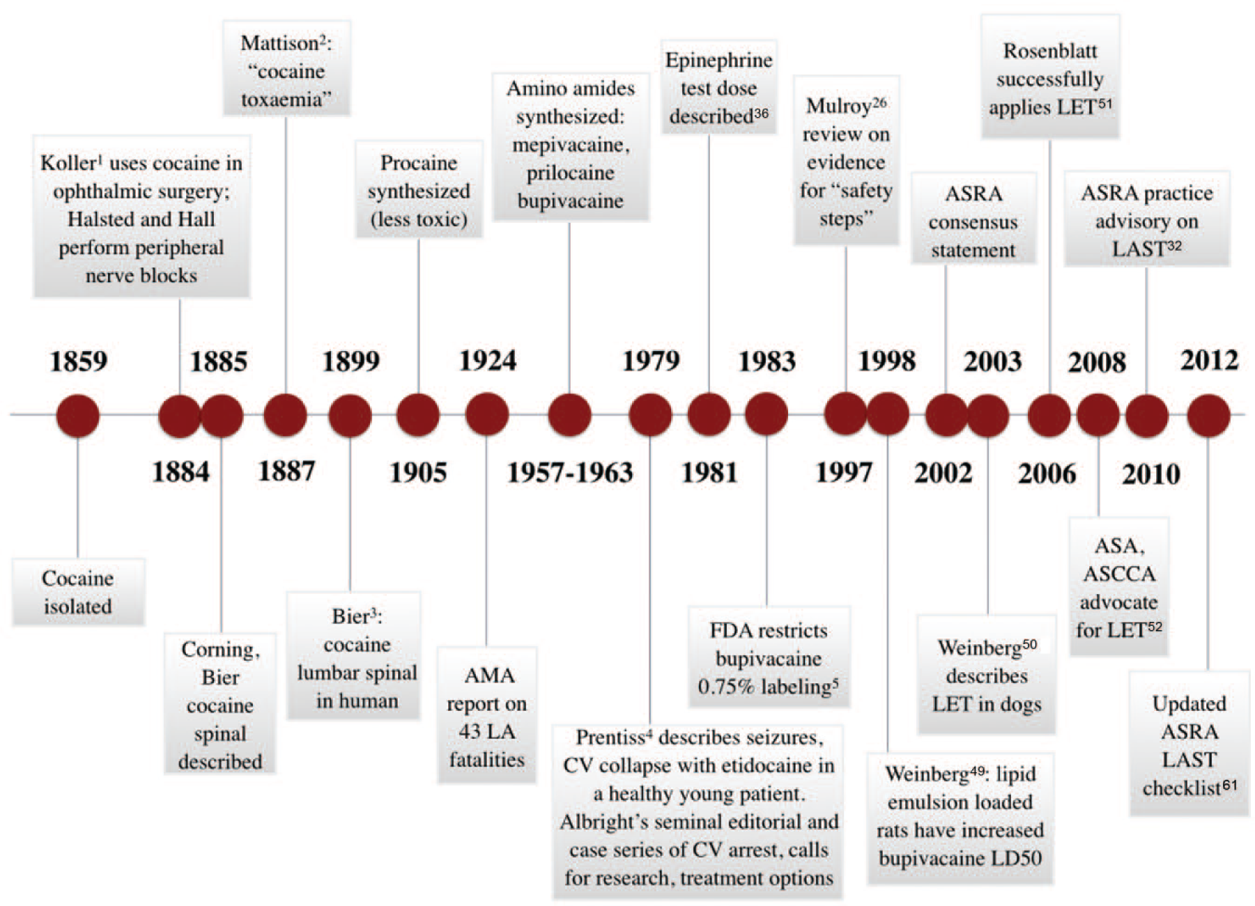 Токсичность местных анестетиков была признана более ста лет назад, но точное количество летальных исходов в настоящее время неизвестно. В 1928 году Американская медицинская ассоциация впервые сообщила о 40 смертельных случаях, связанных с местными анестетиками (МА). Эфирные МА, в частности кокаин, были виновны в ⅔ летальных исходов, связанных с их применением в клинической практике того времени. Эти результаты привели к поиску менее токсичных МА.