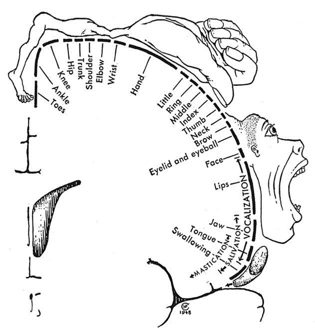 Зоны, иннервируемые клетками ПИ, традиционно изображаются на схемах в виде “моторного гомункулуса”: в верхней части ПИ и парацентральной дольке располагаются корковые отделы двигательных анализаторов (КОДА) мышц нижней конечности, в средней — туловища, верхней конечности, а также шеи, в нижней — мышц языка, лица и глотки. В заднем отделе средней лобной извилины расположен КОДА сочетанного поворота головы и глаз, там же находится двигательный анализатор письменной речи (написание букв, цифр и тд.). Задний отдел нижней лобной извилины является КОДА устной речи.