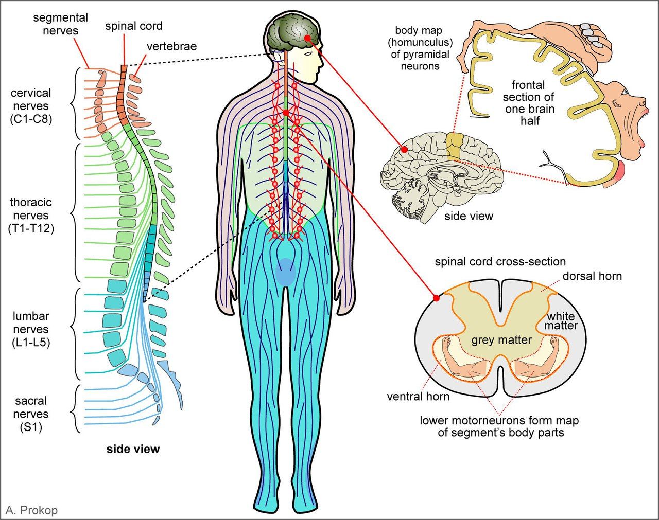 Далее происходит переход от центрального двигательного нейрона к периферическому. Периферический двигательный нейрон включает мотонейроны передних рогов спинного мозга, передние корешки, волокна в составе сплетений и периферических нервов.