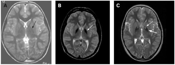 Рисунок 1. Т2-взвешенные снимки. А - здоровый пацент. В - идиопатическая NBIA, стрелкой обозначена зона гипоинтенсивности в медиальном бледном шаре. С - PKAN, регион гиперинтенсивности (тонкая стрелка) окружён гипоинтенсивной зоной (толстая стрелка), так же в медиальном бледном шаре, т.н "глаз тигра" - типичное для PKAN распределение железа.