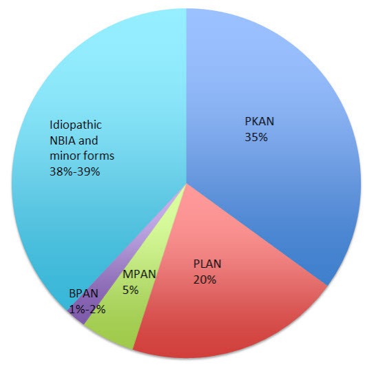 В спектр также были включены еще 6 более редких подтипов: нейроферритинопатия, ацерулоплазминемия, болезнь Куфора — Ракеба, нейродегенерация, связанная с гидроксилазой жирных кислот (FAHN), синдром Вудхауза — Сакати и COASY-протеин-ассоциированная нейродегенерация (CoPAN). Большая часть заболеваний, объединенных термином NBIA наследуется аутосомно-рецессивно, за исключением BPAN и нейроферритинопатии, которые наследуются Х-сцепленно доминантно и аутосомно-доминантно соответственно.