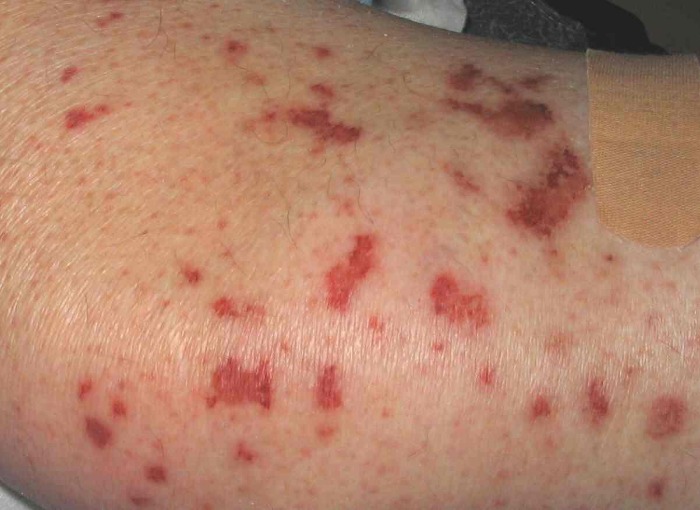 - Лейкоцитокластический васкулит с пальпируемой пурпурой, расположенных преимущественно на разгибательной поверхности верхних и нижних конечностях;