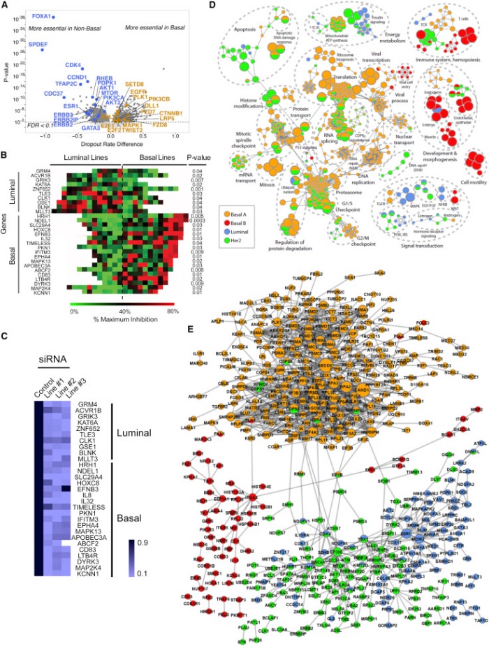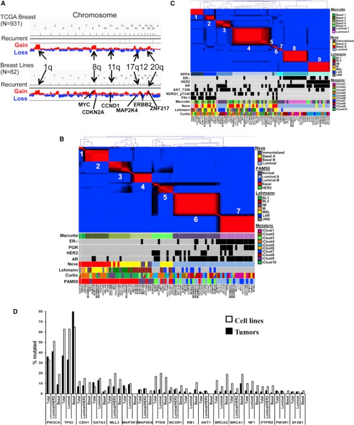 В действительности именно драйверные мутации находят среди раковых генов-«кандидатов» (CAN — candidate cancer genes).Благодаря множественным исследованиям был создан комплексный каталог соматических мутаций и CAN. Когда определенный драйверный ген попадает в ряд различных генов рака МЖ, возникает двухвершинный геномный ландшафт, охватывающий небольшое количество одинаково мутировавших генов. Вершины этого ландшафта соответствуют наиболее часто встречающимся мутациям, опосредующим возникновения РМЖ: TP53, CDH1, PI3K (прим. — фосфатидилинозитол-3-киназы), cyclin D, PTEN, и AKT.