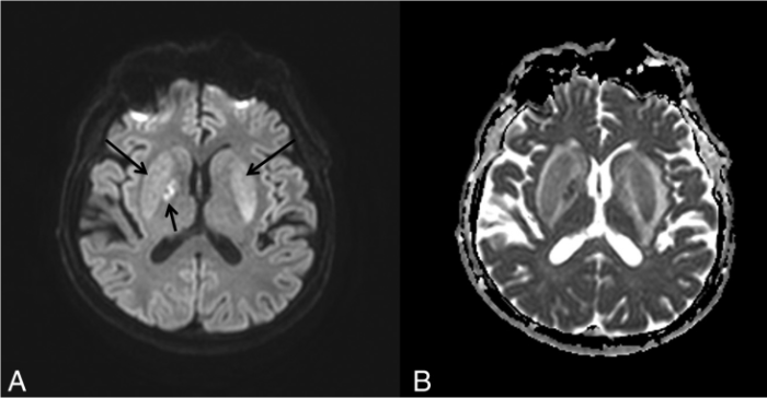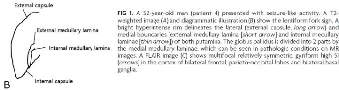 Визуализация мозга чаще всего выявляет его атрофию и увеличение желудочков. Тем не менее иногда, в ограниченном числе случаев при МРТ головного мозга можно обнаружить специфические изменения в области базальных ганглиев, хотя подобные признаки могут сопровождать и метаболический ацидоз, и метаноловую интоксикацию. Изменения, лучше всего заметные в режимах Т2-WI/FLAIR, представляют собой гиперинтенсивные четко очерченные границы скорлупы (латерально — наружная капсула, медиально — внутренняя капсула, внутренняя и наружная мозговые пластинки) с обеих сторон и в целом по форме несколько напоминающие вилку. По сути это является отображением диффузного вазогенного отека базальных ганглиев из-за нарушения процессов ауторегуляции.