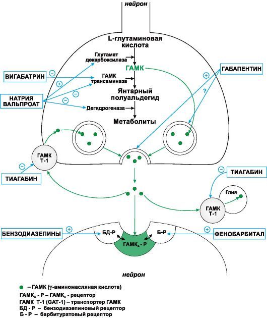 Бензодиазепины (Клоназепам) стимулируют бензодиазепиновые рецепторы ГАМК-А-рецепторного комплекса; повышается чувствительность ГАМК-А-рецепторов к ГАМК и происходит увеличение частоты открытия хлорных каналов, стимулируется поступление в клетку большего числа отрицательно заряженных ионов хлора, следствием чего является гиперполяризация нейрональной мембраны и усиление тормозных эффектов ГАМК. Побочные эффекты: усталость, головокружение, нарушение координации движений, мышечная слабость, депрессивные состояния, нарушения мышления и поведения, аллергические реакции (кожная сыпь). При длительном применении у детей клоназепам может вызвать нарушения умственного и физического развития. При парентеральном введении возможны угнетение дыхания (вплоть до апноэ), гипотензия, брадикардия. Вигабатрин (Сабрил) является структурным аналогом ГАМК и необратимо ингибирует ГАМК-трансаминазу, разрушающую ГАМК. Увеличивает содержание ГАМК в головном мозге. Вигабатрин обладает широким спектром противосудорожного действия, используется для профилактики больших судорожных припадков, эффективен при парциальных судорогах.