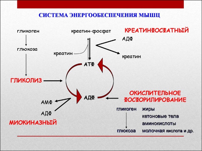 Непрерывное выполнение двигательной работы обеспечивается функционированием и взаимодействием различных энергетических систем. Основной источник энергии для работы мышечной ткани (а также других тканей, органов и систем организма человека) это АТФ. Для осуществления нормальной деятельности мышце необходимо поддерживать концентрацию АТФ в диапазоне от 0,4‒0,5 до 0,25% от массы мышцы.