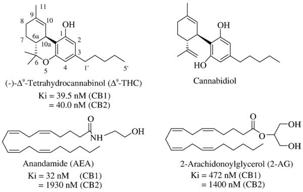 Рисунок 1 | Структурные формулы фитоканнабиноидов Δ9-тетрагидроканнабинола (Δ9-THC) и каннабидиола и эндоканнабиноидов анандамида (AEA) и 2-арахидоноилглицерола (2-AG). Ki показывает аффинность к рецепторам CB1 и CB2. Источник: Vemuri V. K., Janero D. R., Makriyannis A. Pharmacotherapeutic targeting of the endocannabinoid signaling system: drugs for obesity and the metabolic syndrome //Physiology & behavior. – 2008