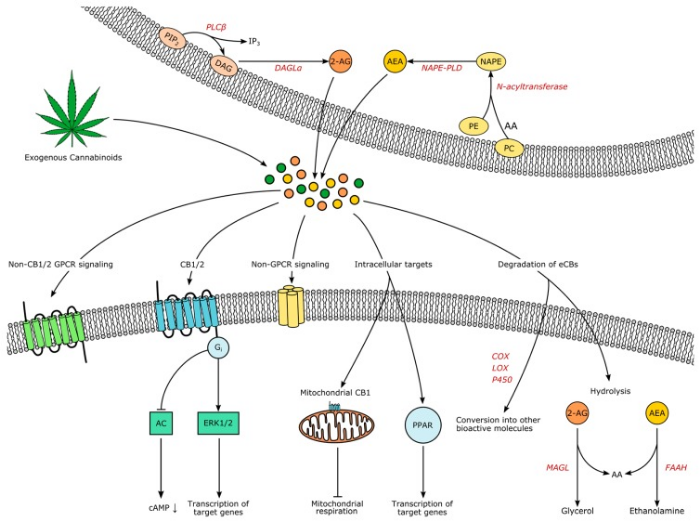Анандамид синтезируется из N-арахидоноилфосфатидилэтаноламина (NAPE) с помощью N-ацилтрансферазы и NAPE-PLD. Эти ферменты обнаруживаются в ЖКТ и ЦНС. 2-AG синтезируется из диацилглицерола при гидролизе его ДАГ-липазами альфа и бета. Есть и другие пути образования анандамида и 2-AG.