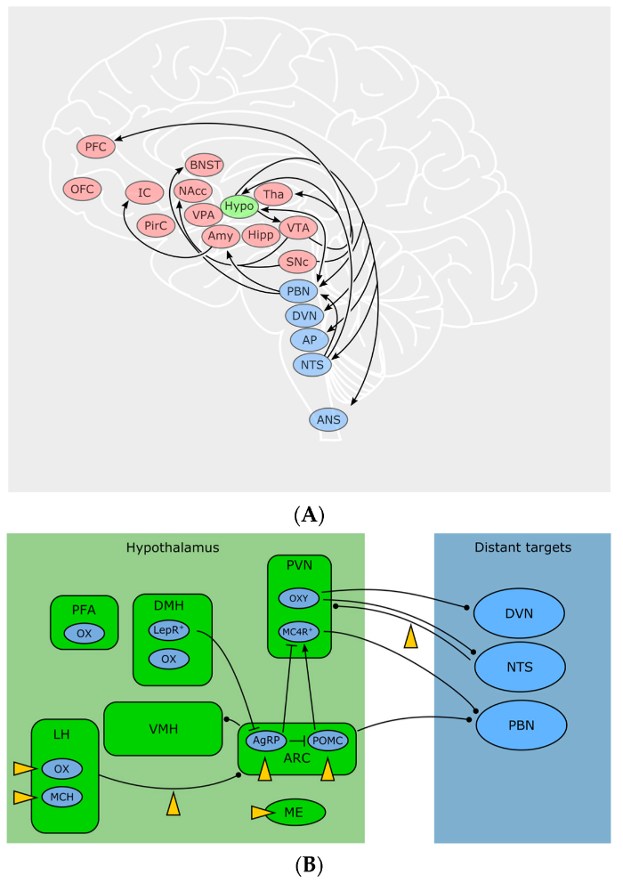 Расшифровка сокращений: PFA — перифорникальная область, LH — латеральный гипоталамус, DMH — дорсомедиальный гипоталамус, VMH — вентромедиальный гипоталамус, PVN — паравентрикулярное ядро, ARC — аркуатное ядро, ME — срединное возвышение, OX — орексин, MCH — меланинконцентрирующий гормон, LEPR — рецептор лептина, OXY — окситоцин, MCR4 — рецептор меланокортина 4 типа, DVN — дорсальное ядро вагуса, NTS — ядро одиночного пути, PBN — парабрахиальное ядро.