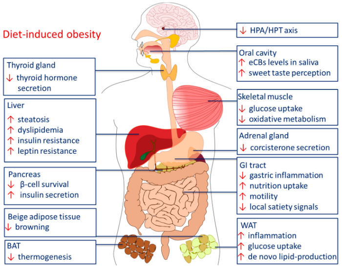 Гиперактивация эндоканнабиноидной системы может оказаться связующим звеном между ожирением и сопутствующими ему болезнями. Гиперактивация ЭКС обнаруживается как в гипоталамусе, так и в периферических тканях, включая печень и жировую ткань.