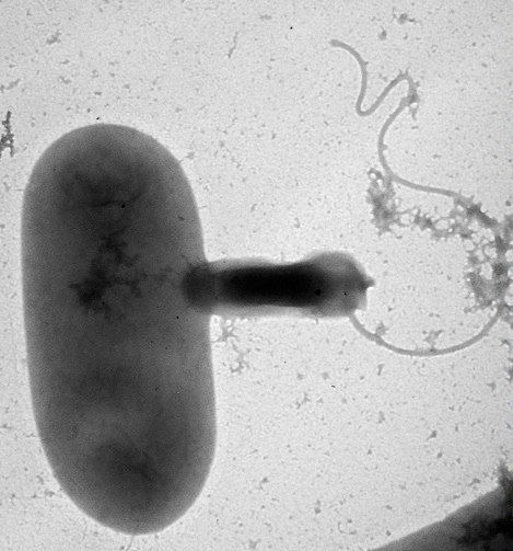 Рисунок 1 | Внедрение Bdellovibrio bacteriovorus в клетку бактерии-хозяина, просвечивающая электронная микроскопия.
