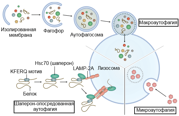 Согласно современным данным, аутофагия подразделяется на три типа: микроаутофагия, шаперон-зависимая аутофагия, макроаутофагия (Рис. 2).