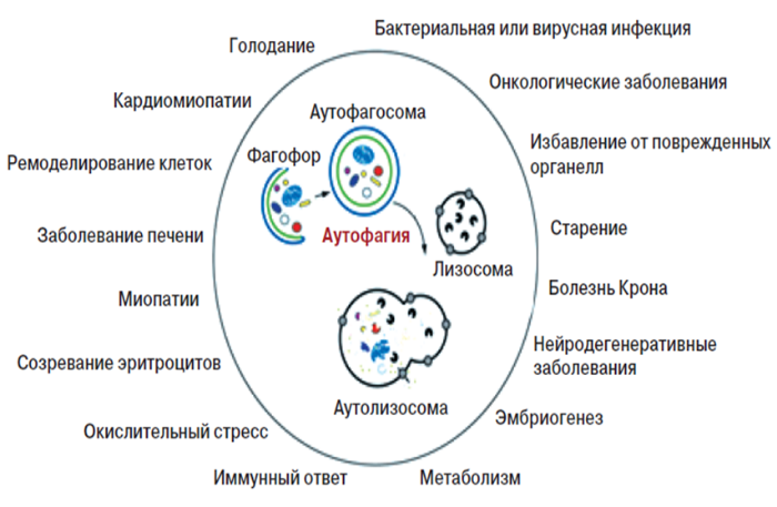 Аутофагия — это процесс прижизненной деградации с помощью лизосом измененного метаболитами содержимого цитоплазмы для поддержания клеточного и энергетического гомеостаза [1]. Аутофагия считается «программируемой» гибелью всей клетки или отдельных ее частей. У млекопитающих аутофагия наблюдается во многих физиологических процессах: реакции на голодание, контролировании роста клеток, процессах врожденного иммунитета и защите от старения, избавлении от долгоживущих белков и поврежденных органелл, при дифференцировке и трансформации клеток (Рис. 1). Это играет важную роль в поиске решений лечения ряда заболеваний, включая канцерогенез и нейродегенеративные болезни [2].