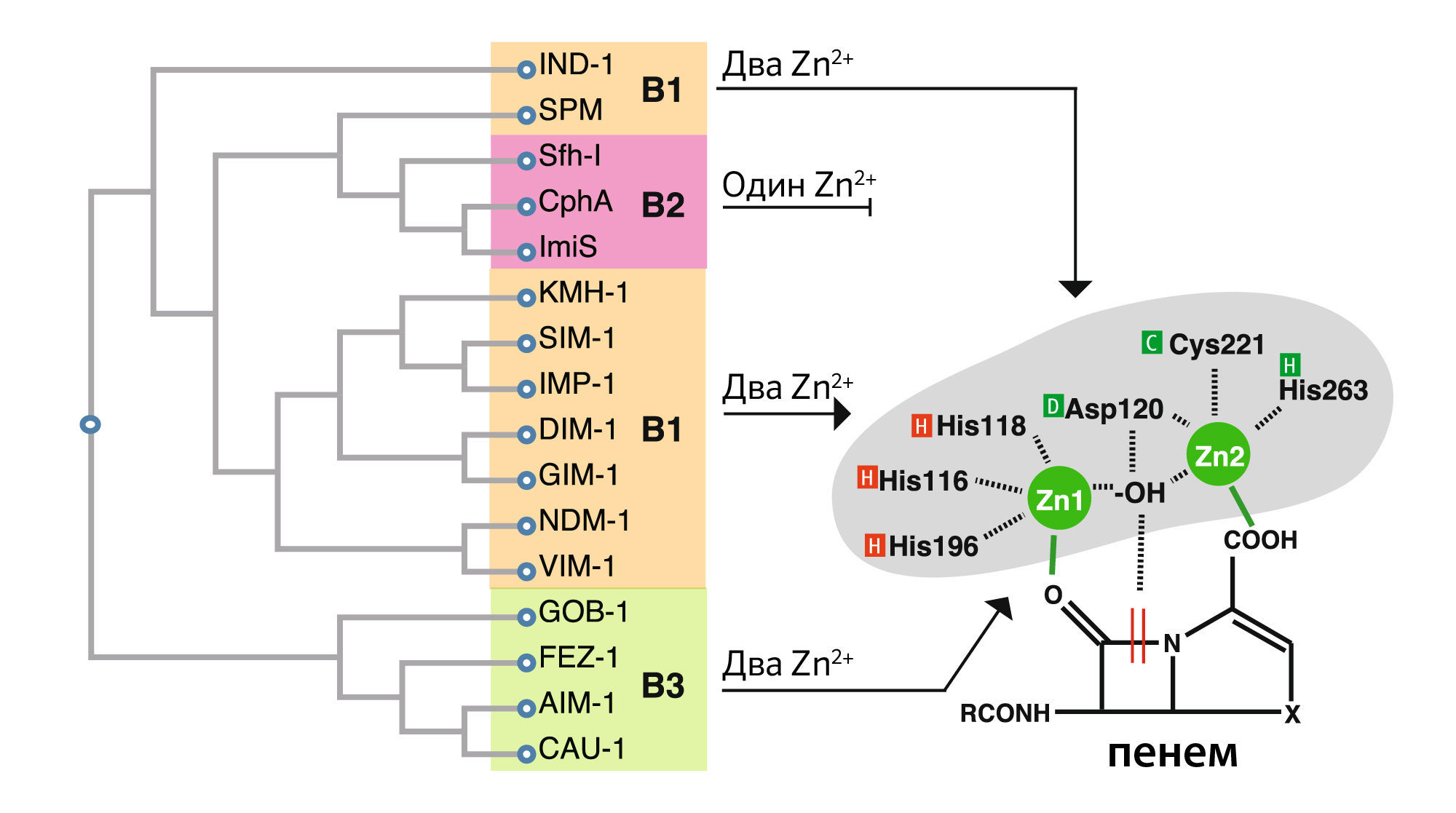 β-Лактамазы представляют собой чрезвычайно разнообразное семейство ферментов, поэтому для их систематизации используются две основные классификационные системы. Молекулярная классификация Эмблера делит β-лактамазы на четыре класса — A, B, C и D — по сходству аминокислотной последовательности и структурным особенностям активного центра [1]. Ферменты классов A, C и D — это сериновые β-лактамазы, в активном центре которых ключевую роль играет остаток серина, тогда как класс B — это металло-β-лактамазы (MBL), использующие для гидролиза ион цинка [1].