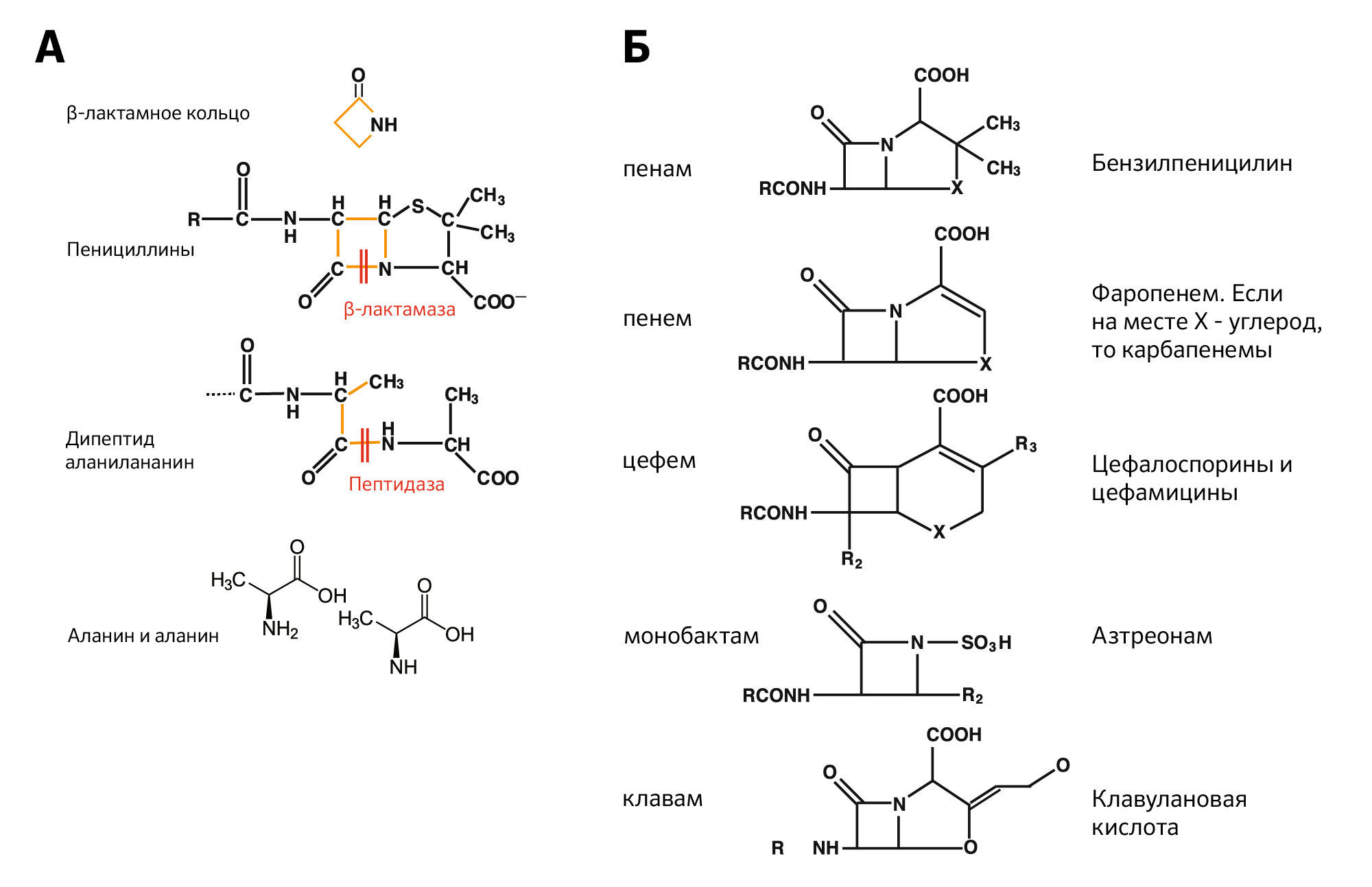 Б) Клинически используемые β-лактамы можно классифицировать по пяти основным фармакофорам, способным проявлять различную антимикробную активность. Справа указаны представители.