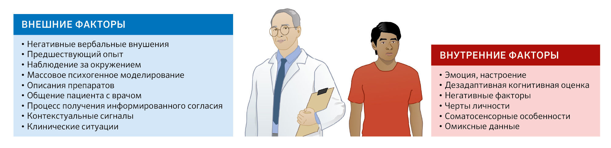 Наблюдение того, что участники могут испытывать побочные эффекты после получения плацебо-таблеток, инъекций или проведения ложных процедур и операций, вызвало интерес к пониманию механизмов ноцебо-эффектов. К их возникновению приводят внутренние и внешние факторы. Отрицательные ожидания могут быть связаны с негативными вербальными внушениями (например, «лечение было прекращено»), предыдущим опытом (например, повышение интенсивности болезненного воздействия) и наблюдением за окружением (например, как кто-то страдает от побочного эффекта). Массовое психогенное моделирование (например, убеждение, что ветрогенераторы вызывают головную боль), информационные материалы для пациентов (например, списки побочных эффектов), общение между врачом и пациентом (например, «эта процедура будет болезненной») и клинические ситуации также могут вызывать ноцебо-эффекты. Внутренние факторы включают индивидуальные ожидания пациентов, генетическую предрасположенность, когнитивные оценки, а также негативное настроение и эмоции (Рисунок 1).