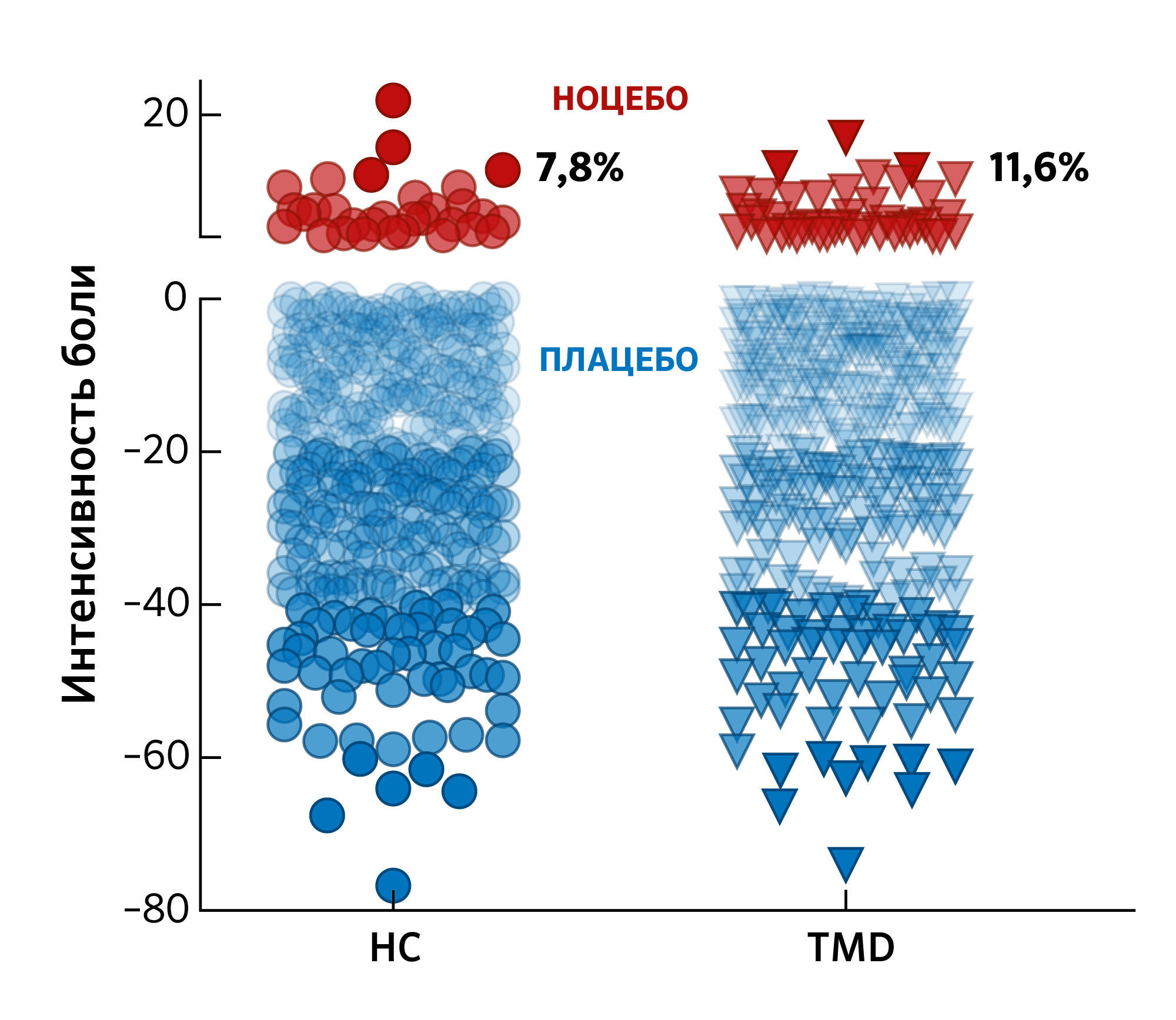 В каждом исследовании есть некоторые участники, реагирующие на плацебо негативным образом. В перекрестном исследовании со здоровыми участниками без боли и участниками с хронической болью авторы оценили долю ноцебо-реакторов. Ноцебо-реакторы — это те, кто негативно отреагировал на позитивную плацебо-манипуляцию, состоящую из вербальных внушений и обусловливания (выработке научения по Павлову). Исследователи обнаружили, что 7,8 % и 11,6 % участников соответственно сообщили о сильной боли после плацебо-манипуляции (Рисунок 2). Ноцебо-реакторы характеризовались более высоким уровнем страха перед болью, катастрофизацией и эмоциональным дистрессом. Этот результат согласуется с долей прекращения лечения (выбывания), наблюдаемой в клинических испытаниях, описанных выше.