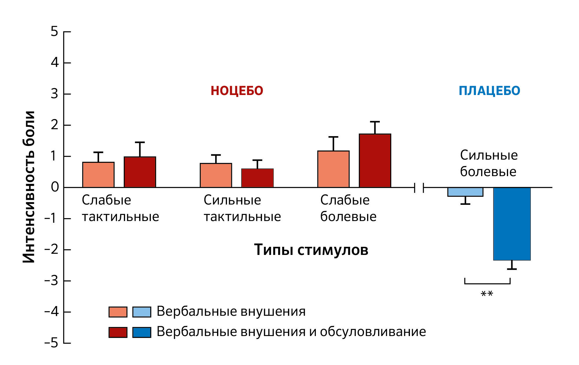 В качестве модели для изучения механизмов плацебо использовалась ноцебо-индуцированная гипералгезия — повышенное субъективное восприятие боли после того, как пациент или участник исследования получает плацебо (например, имитацию крема), подвергается ложной операции (например, надрезу на коже) или просто слышит упоминание о возможном усилении боли. Коллока и соавт. сравнили эффекты только вербальных внушений (т.е. без предшествующего болевого опыта) и классического обусловливания (т.е. с предварительным воздействием) сильных болевых стимулов. Негативные внушения о предстоящем сильном болевом воздействии сочетались либо с едва заметными, либо со слабыми болезненными электрическими разрядами. Результаты показали, что участники, которых просто проинформировали о предстоящей сильной боли, получившие едва заметные стимулы, воспринимали их как более болезненные по сравнению с теми, кто предварительно подвергался сильным болевым воздействиям (Рисунок 3). Когда использовались болевые стимулы, то вербальные внушения сами по себе и вербальные внушения в сочетании с обусловливанием вызывали ноцебо-гипералгезию сходной величины. Этот вывод о том, что ноцебо-эффекты имеют сопоставимую величину при использовании вербальных внушений и обусловливания, отличается от вывода о плацебо-эффектах, где обусловливание оказывает более сильное воздействие, чем вербальные внушения. Эти результаты были воспроизведены в последующих исследованиях.