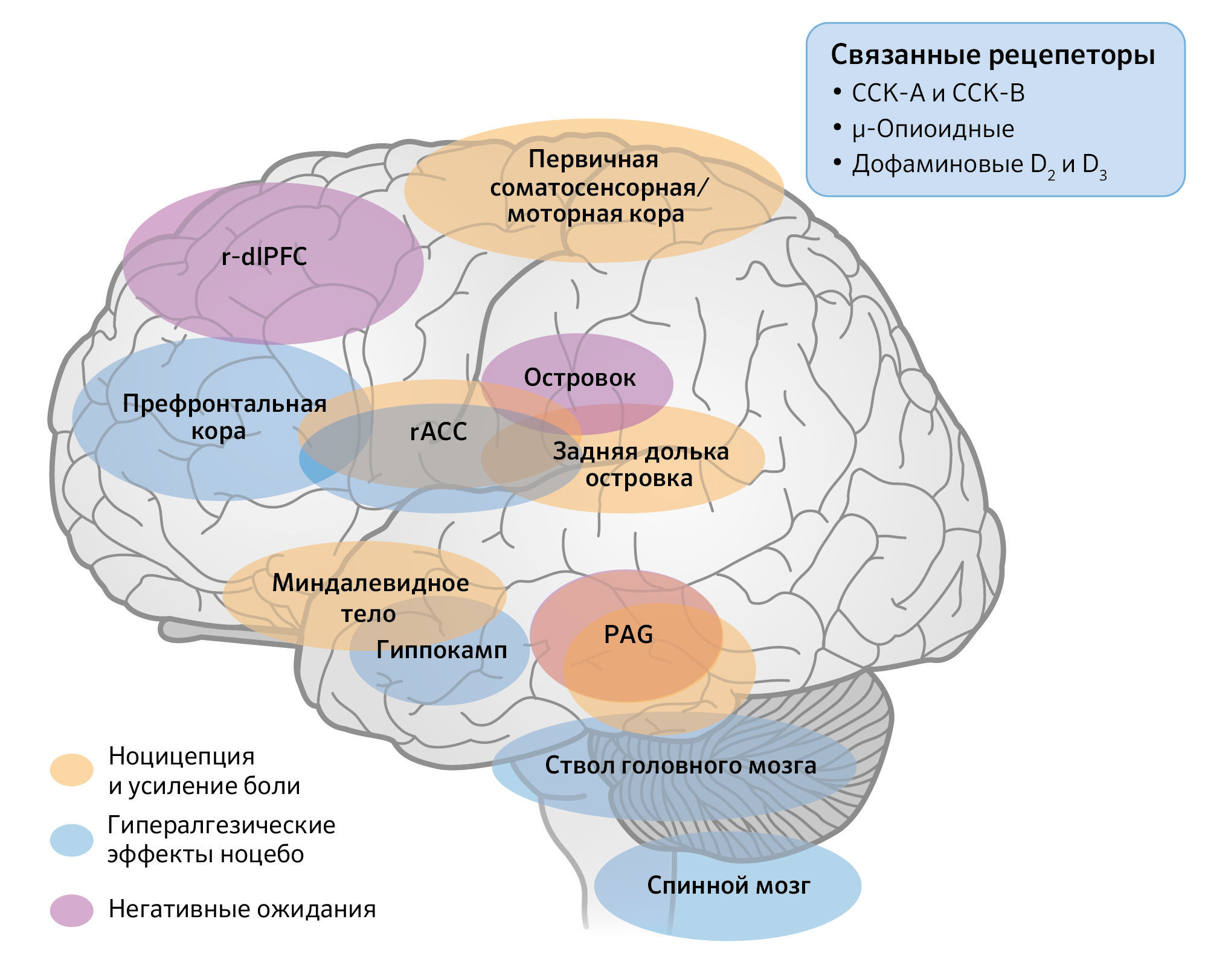 - Нейровизуализационные исследования связывают ноцебо-эффекты с активацией нисходящих модуляторных систем, включающих префронтальные зоны, ствол мозга и спинной мозг.