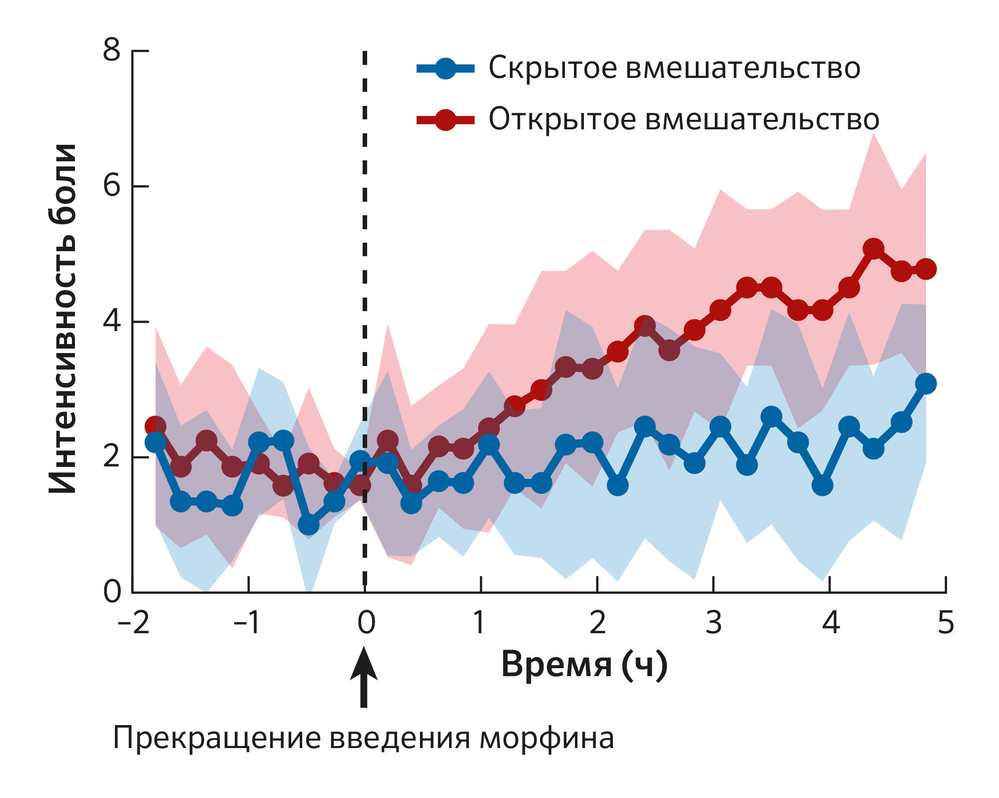 Открыто-скрытое прерывание лечения — это процедура, позволяющая оценить влияние информирования на медицинские исходы в клинических условиях. Лечение проводилось с помощью компьютерного инфузионного насоса, и послеоперационным пациентам либо сообщали о времени прекращения введения диазепама и морфина, либо нет (Рисунок 5). У пациентов, которых открыто предупредили о прерывании, наблюдался резкий рост тревожности и боли, тогда как при скрытом прерывании, контролируемом компьютером, симптомы не изменялись.