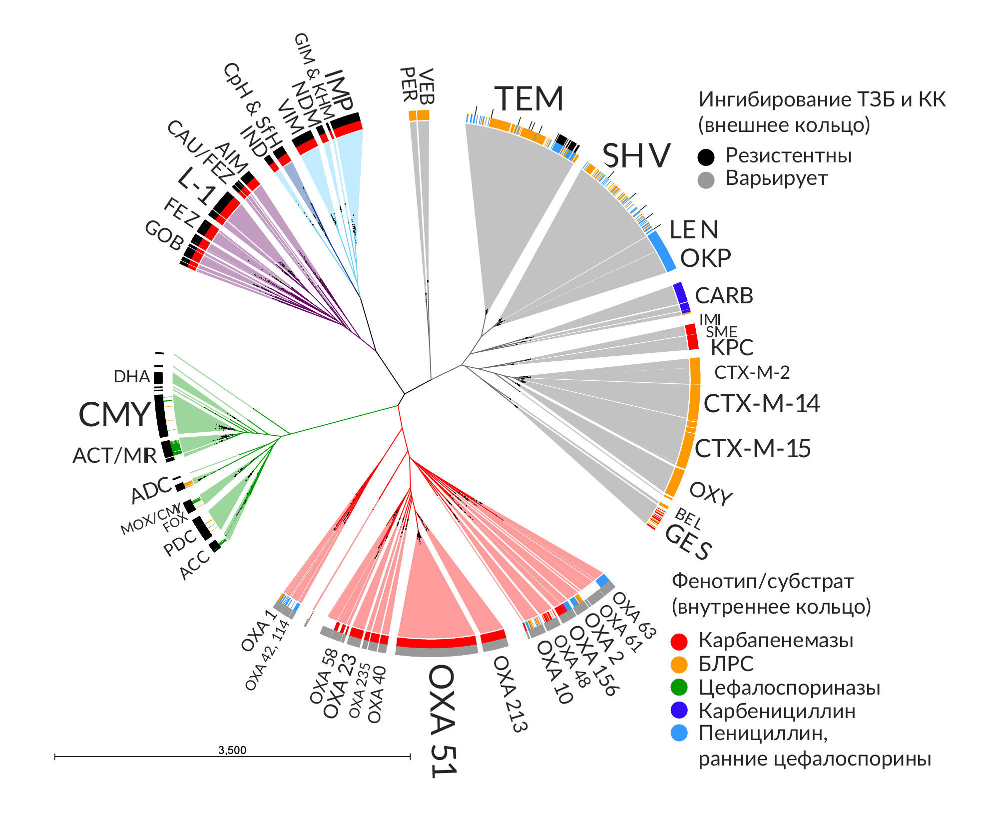 За десятилетия клинического применения β-лактамов бактерии выработали множество разнообразных β-лактамаз. Эти ферменты существовали у бактерий задолго до эры современных антибиотиков, будучи эволюционно связанными с пенициллин-связывающими белками (ПСБ) бактерий [3]. В настоящее время описано более 8000 β-лактамаз, способных разрушать β-лактамное кольцо [9, 15]. Такая быстрая эволюция обусловлена как спонтанными мутациями, так и распространением генов β-лактамаз между бактериями посредством плазмид и других мобильных элементов ДНК. Для медицины это означает постоянное появление «супербактерий», создающих серьезную угрозу неэффективности терапии [6].