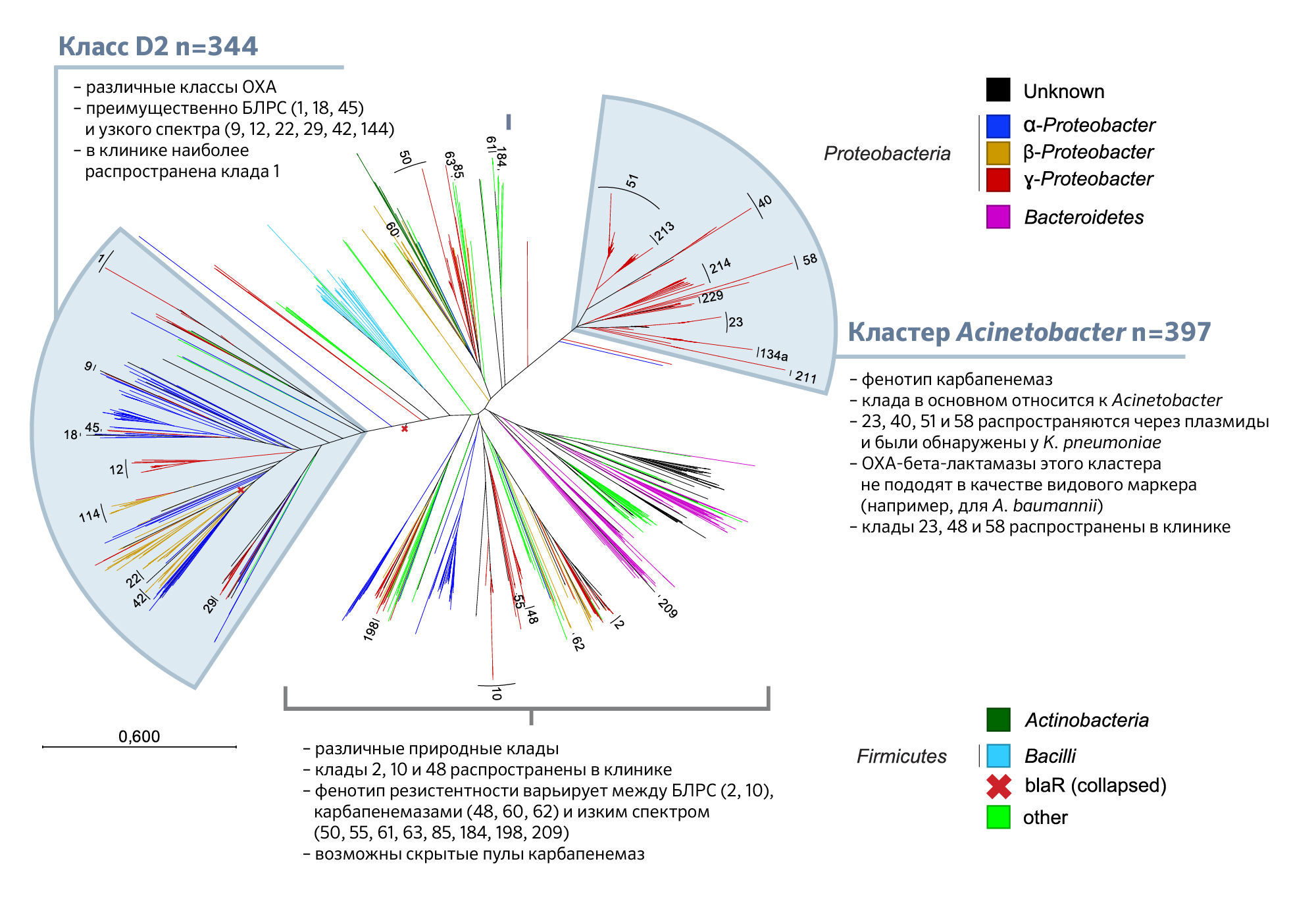 Несколько оксациллиназ (OXA-11, OXA-14 – OXA-20) являются ESBL-модификациями, гидролизующими расширенный спектр цефалоспоринов. Карбапенемазы класса D включают семейства OXA-48-like (энтеробактерии) и OXA-23-like (ацинетобактер) – эти ферменты широко распространились в госпитальной среде по всему миру [1–3].