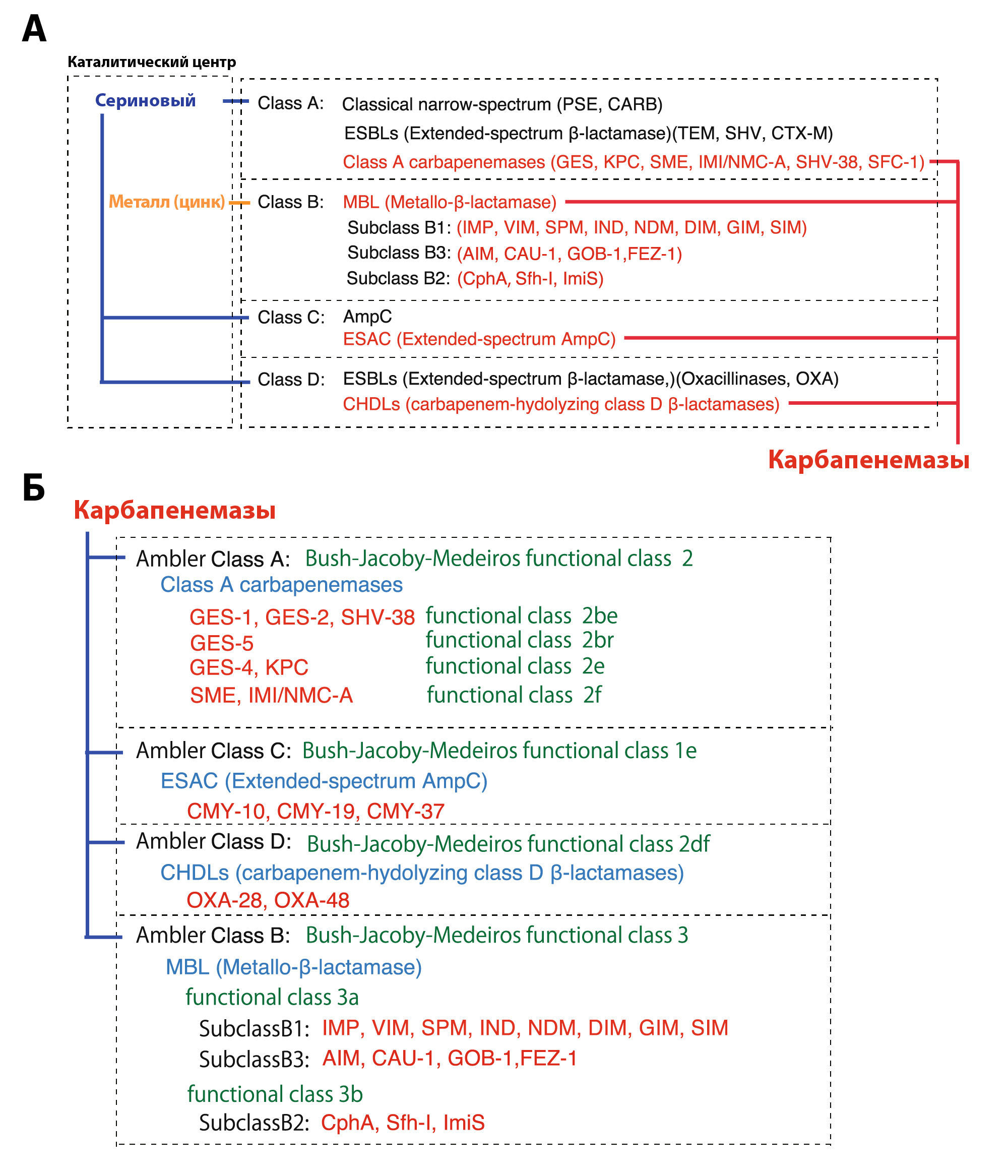 Карбапенемазы представлены во всех классах, от A до D, системы классификации Амблера.