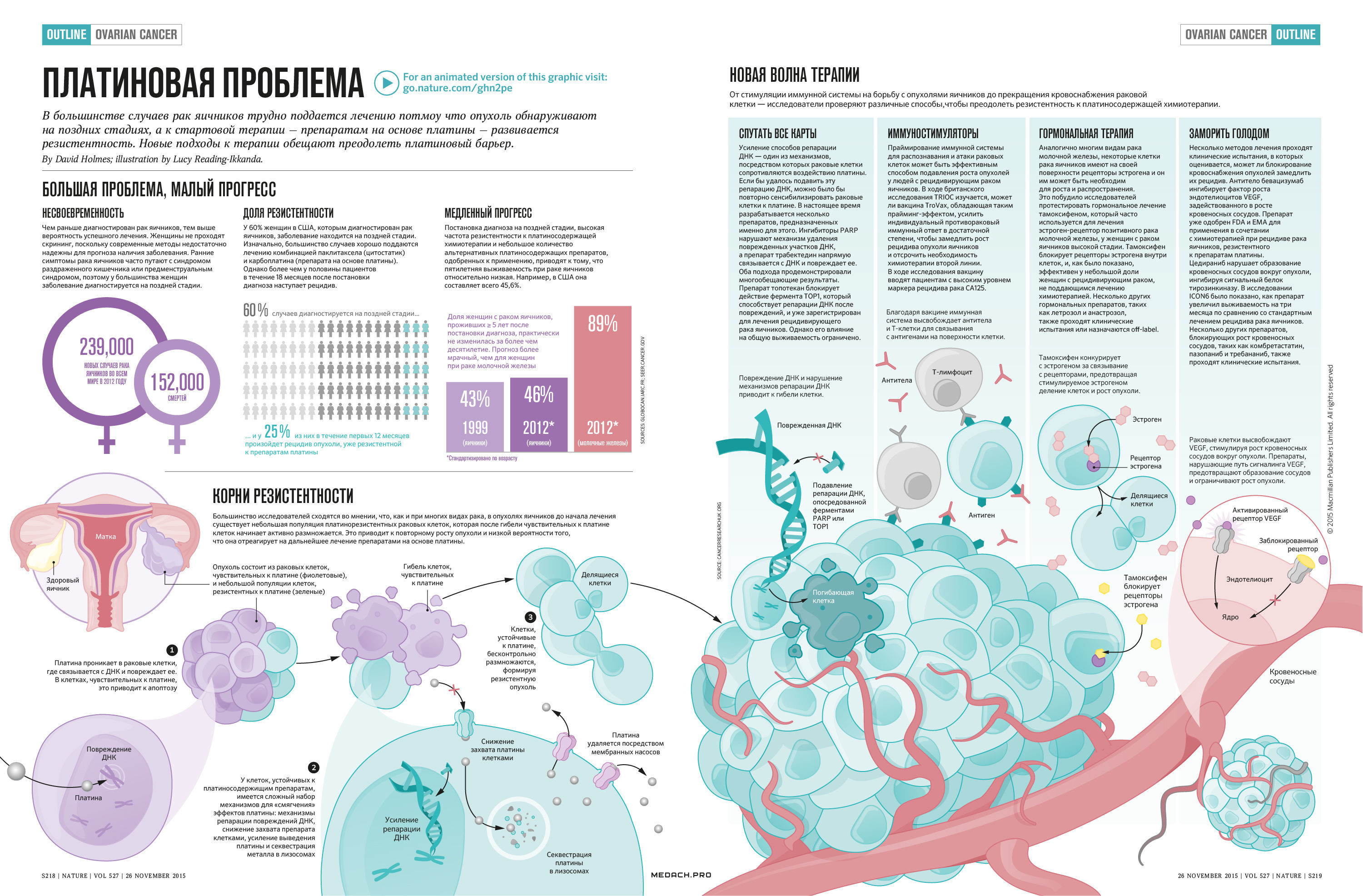 Рак яичников трудно поддается лечению в большинстве случаев потому, что опухоли часто обнаруживают на поздних стадиях, а к стартовой терапии — препаратам на основе платины — развивается резистентность. Новые подходы к терапии обещают преодолеть платиновый барьер.