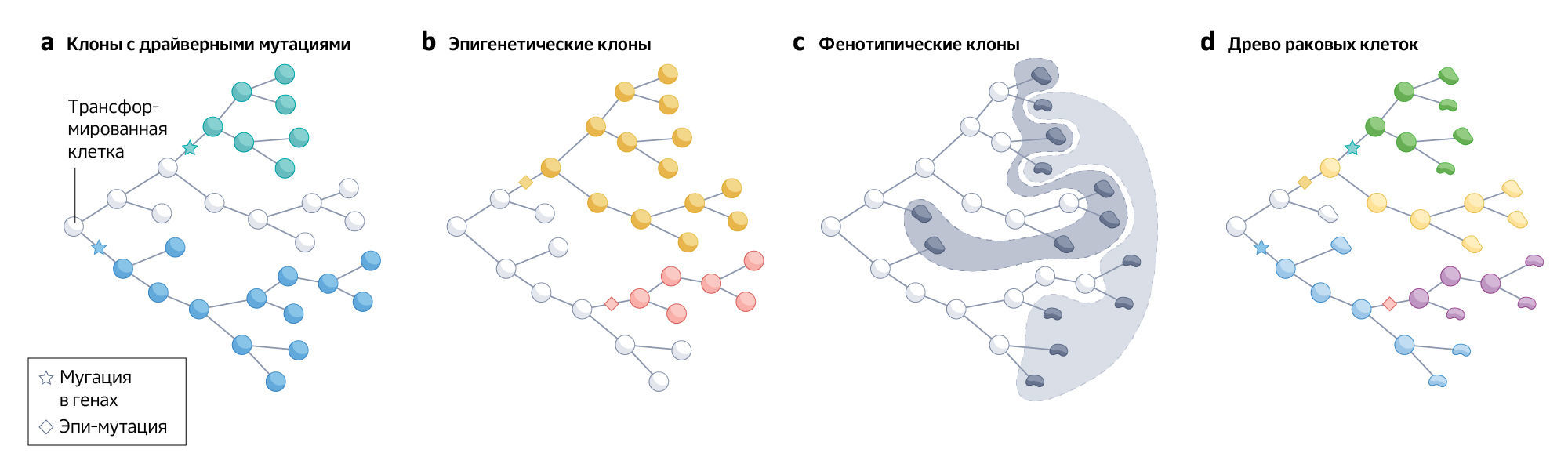 Существует несколько альтернативных взглядов на клональную идентичность: в настоящее время несколько исследований используют эпигенетику для реконструкции эволюции рака. Некоторые из них поддерживают фенотипическую или функциональную клональную идентичность. Например, клон был определен как “группа клеток с одинаковым фенотипом, которые постоянно выражают этот фенотип со времени их последнего общего предка”. Согласно этому определению, набор стволовых клеток можно назвать клоном, если они имеют одинаковый фенотип и имели недавнего общего предка, но при этом исключить все нестволовые клетки, которые были частью той же ветви на древе клеточных линий. В отличие от этого, в биологии развития клон определяется как «in vivo потомки одной предковой клетки», что эквивалентно монофилетической кладе в филогенезе. В основе любой опухоли лежит древо клеточных линий, описывающее родственные связи и историю клеток внутри рака. Определение клонов сводится к тому, как именно это эволюционное дерево разделяют на части (рис. 2).