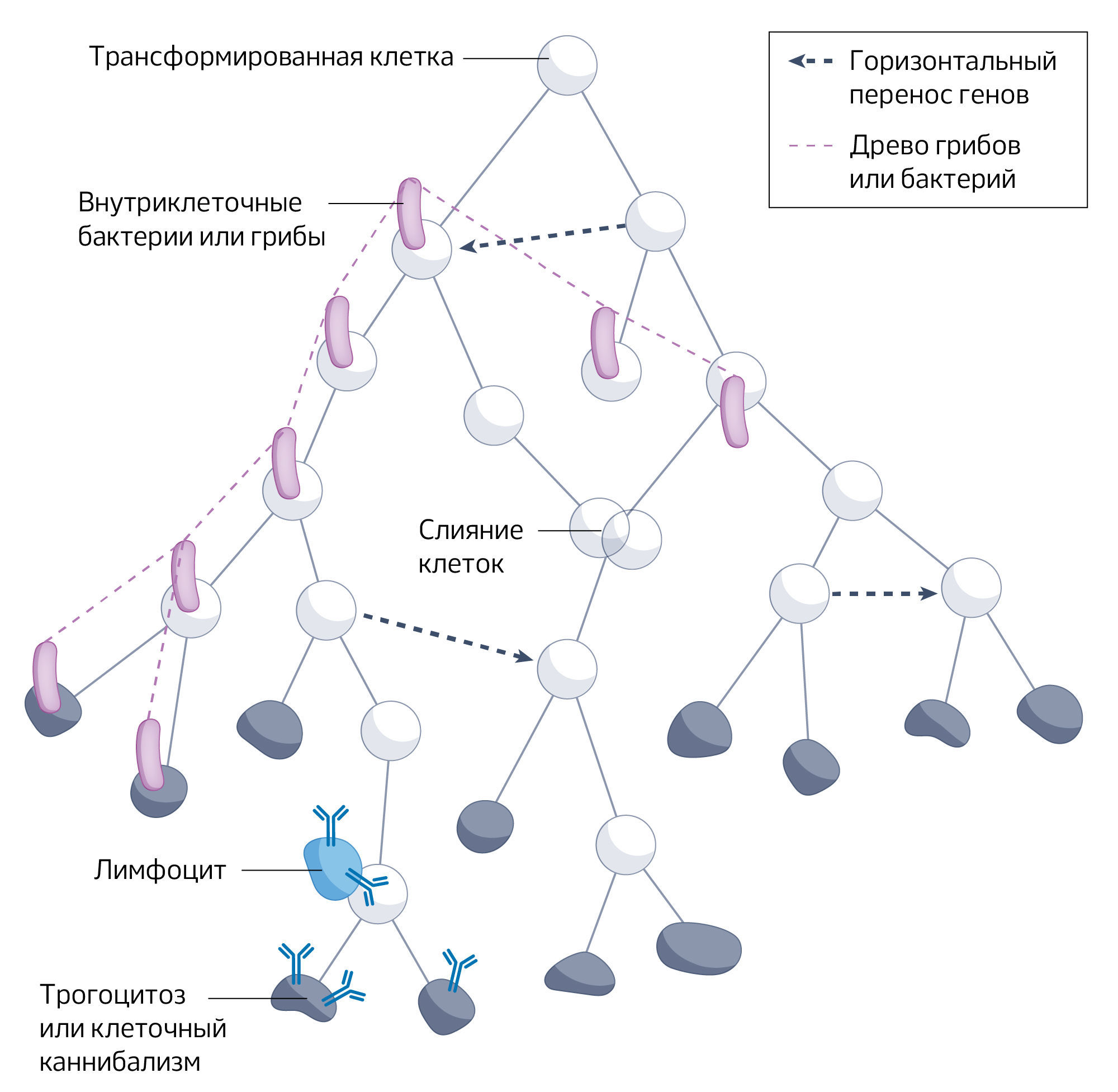 Таким образом, внутриклеточные микроорганизмы могут вносить вклад в клональную эволюцию предсказуемыми способами, которые могут быть реализованы в модели клональной эволюции. Гетерогенное и очаговое распределение внутриклеточных бактерий привело к понятию «микробного внутриклонального разнообразия», когда разная приспособленность раковых клеток одного и того же генетического клона зависит от присутствия внутриклеточных бактерий. Однако существуют теоретические проблемы, препятствующие интеграции роли микроорганизмов в клональную эволюцию. Одна из них — способ передачи этих микроорганизмов. Они могут передаваться как вертикально и, таким образом, представлять собой просто субклон инфицированных раковых клеток, так и горизонтально, переходя от одной клетки к другой. Во втором случае они ставят под сомнение древовидную форму наследственности у раковых клеток. Кроме того, сами бактерии могут претерпевать собственную эволюционную динамику. Биоинформационный анализ метаболической активности внутриопухолевых бактерий позволил предположить, что бактерии находятся под собственным селективным давлением, формируемым опухолевыми клетками и их микроокружением. Таким образом, на линии раковых клеток и линии микроорганизмов могут действовать различные селективные процессы, а эволюция раковых клеток может представлять собой не простое ветвящееся дерево, а включать слияние и передачу признаков между ветвями (рис. 3). Генетическое и негенетическое наследование может быть не только вертикальным, но и иногда горизонтальным. Кроме того, клональная эволюция может касаться не только раковых клеток, но и внутриклеточных бактерий и грибов, которые могут изменять приспособленность раковых клеток. Эти механизмы ставят под сомнение в первую очередь теоретическую эффективность существующей модели клональной эволюции, но не фактическую степень участия раковых клеток в эволюции. Таким образом, они открывают возможности для улучшения теоретической мощности модели клональной эволюции.