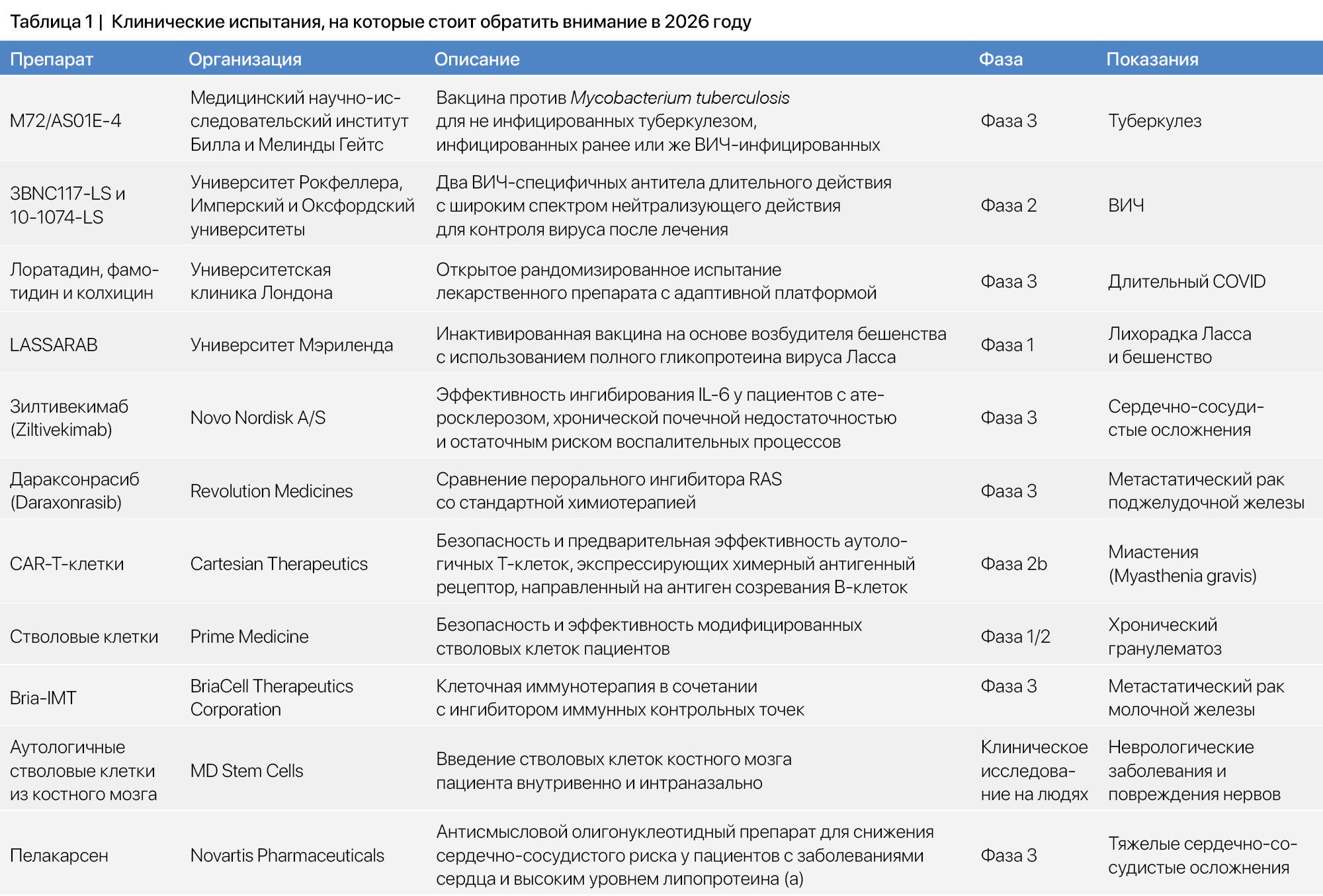 От вакцин нового поколения до редактирования генов и терапии стволовыми клетками — ученые проверяют новые смелые подходы к лечению самых сложных заболеваний, с которыми сталкивается человечество. Эти клинические испытания препаратов от туберкулеза, лихорадки Ласса, рака и аутоиммунных заболеваний позволяют заглянуть в будущее, где точная медицина, инновации и настойчивость могут изменить глобальную систему здравоохранения (табл. 1).