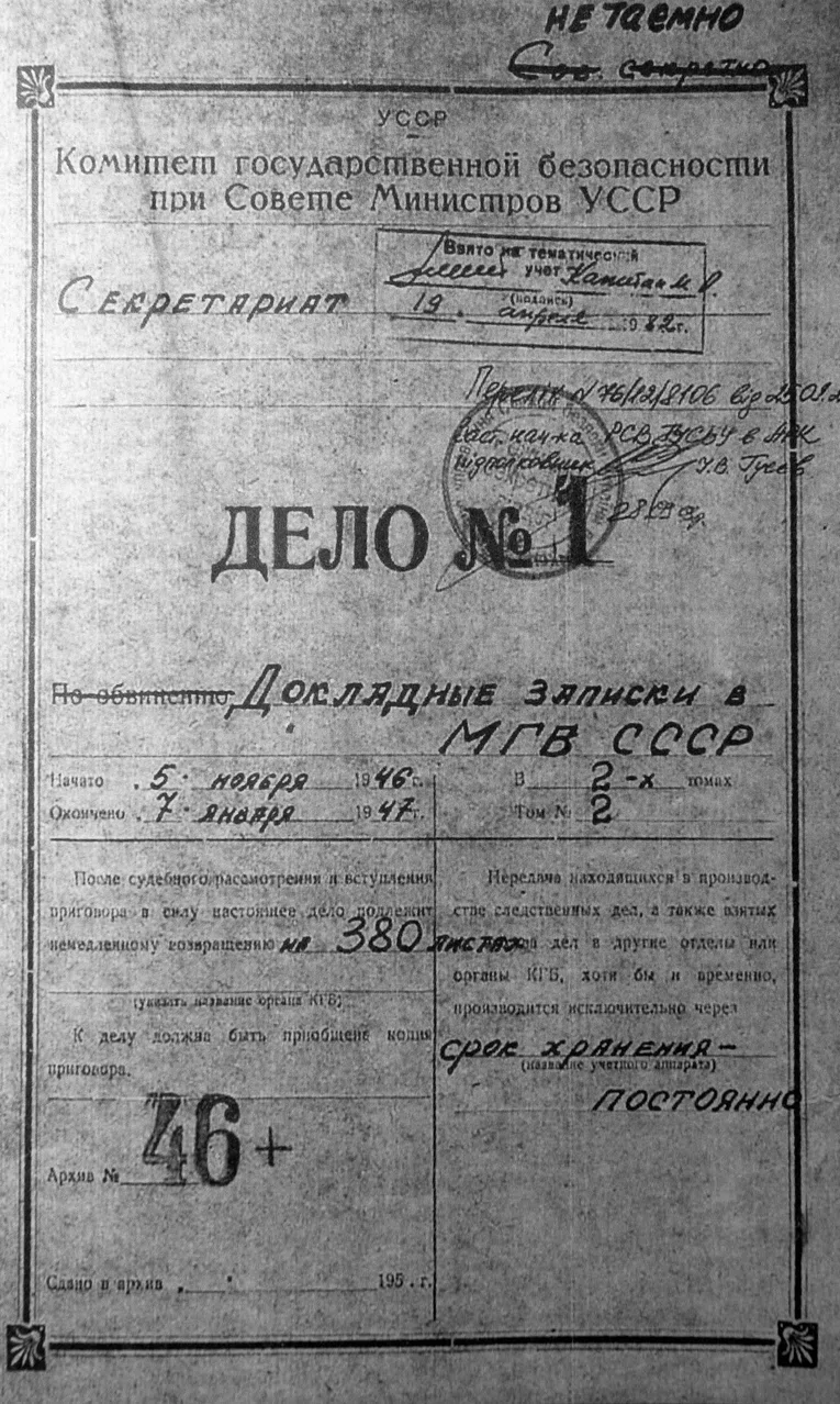 Обложка архивного дела с докладными в том числе на свт. Луку. Фото: Центр наследия свт. Луки Феодоровского монастыря, 1946-1947 годы.